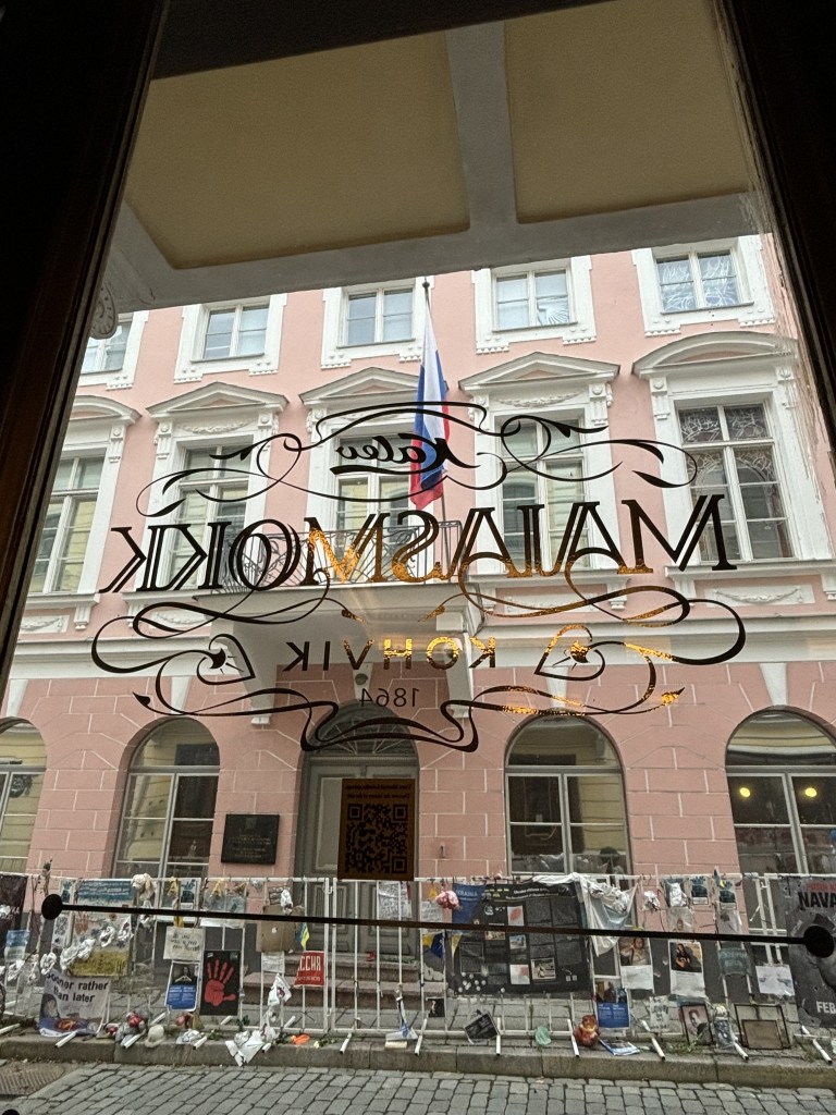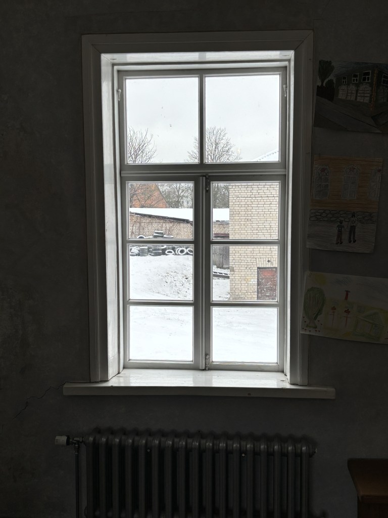 The windows of local residential flats as seen from a hallway near one of my classrooms (Daugavpils, Latvia)Side windows of a Stalin-era building along. November Street, one of our major thoroughfares here in Daugavpils, LatviaLooking north and west toward the Daugava River from my office in “The New Building,” at Daugavpils University. I hold lunchtime conversation classes here. (Daugavpils, Latvia)Looking out from a synagogue window. At the Green Synagogue (1845), one of the oldest wooden structures in the city of Rezekne, population 27,000. (Latvia)From the window of Tallinn’s oldest coffee shop, Cafe Maiasmokk (circa 1864). That’s the Russian Embassy across the street–note the protest paraphernalia. (Tallinn, Estonia)