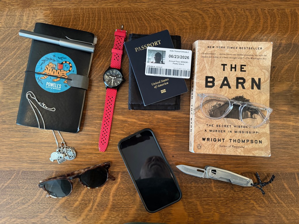 My everyday carry includes from top left…A notebook and roller ball pen for fun writing when on the run, my favorite old-school analog watch from a California company, Vaer, my wallet with key documents including my passport and Peaks Island annual ferry pass, a good read I can tuck into my backpack–in this instance, The Barn, a non-fiction work about the 1955 murder of Emmett Till in Mississippi, glasses from Warby Parker, a pocket knife with practical blades and tools, my iPhone, Warby Parker shades and finally, my necklace with silver charms from different countries I have visited.